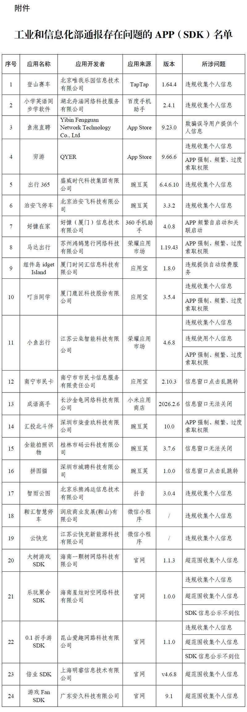 13日,工业和信息化部信息通讯料理局发布《对于侵害用户职权行动的APP(SDK)通报》称,依据《个东说念主信息保护法》《聚积安全法》《电信条例》《电信和互联网用户个东说念主信息保护划定》等法律规则,工业和信息化部赓续整治APP侵害用户职权的非法行动。近期,工业和信息化部组织第三方检测机构进行抽查,共发现24款APP及SDK存在侵害用户职权行动,给以通报。