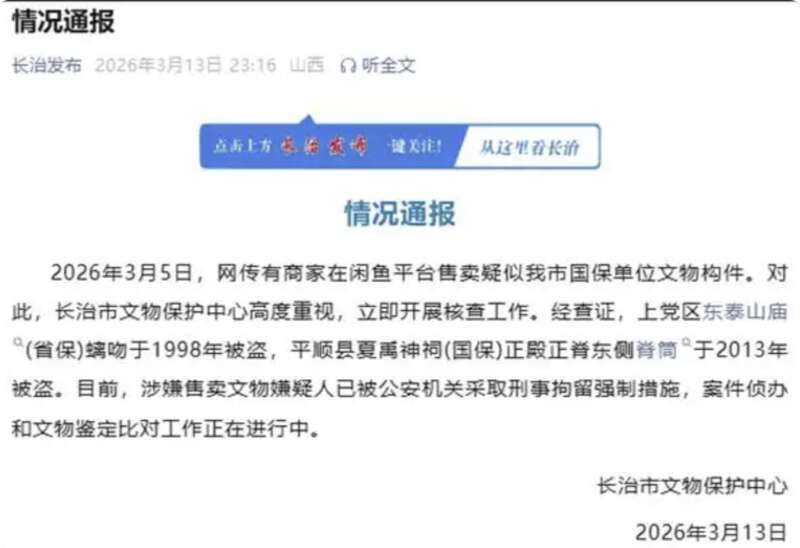 据山西省长治市微信公众号“长治发布”音讯,3月13日,长治市文物保护中心发布情况通报称,3月5日,网传有商家在闲鱼平台售卖疑似我市国保单元文物构件。对此,长治市文物保护中心高度可爱,立即开展核查职责。经查证,上党区东泰山庙(省保)螭吻于1998年被盗,平顺县夏禹神祠(国保)正殿正脊东侧脊筒于2013年被盗。现在,涉嫌售卖文物嫌疑东说念主已被公安机关给与刑事拘留强制措施,案件侦办和文物强硬比对职责正在进行中。
