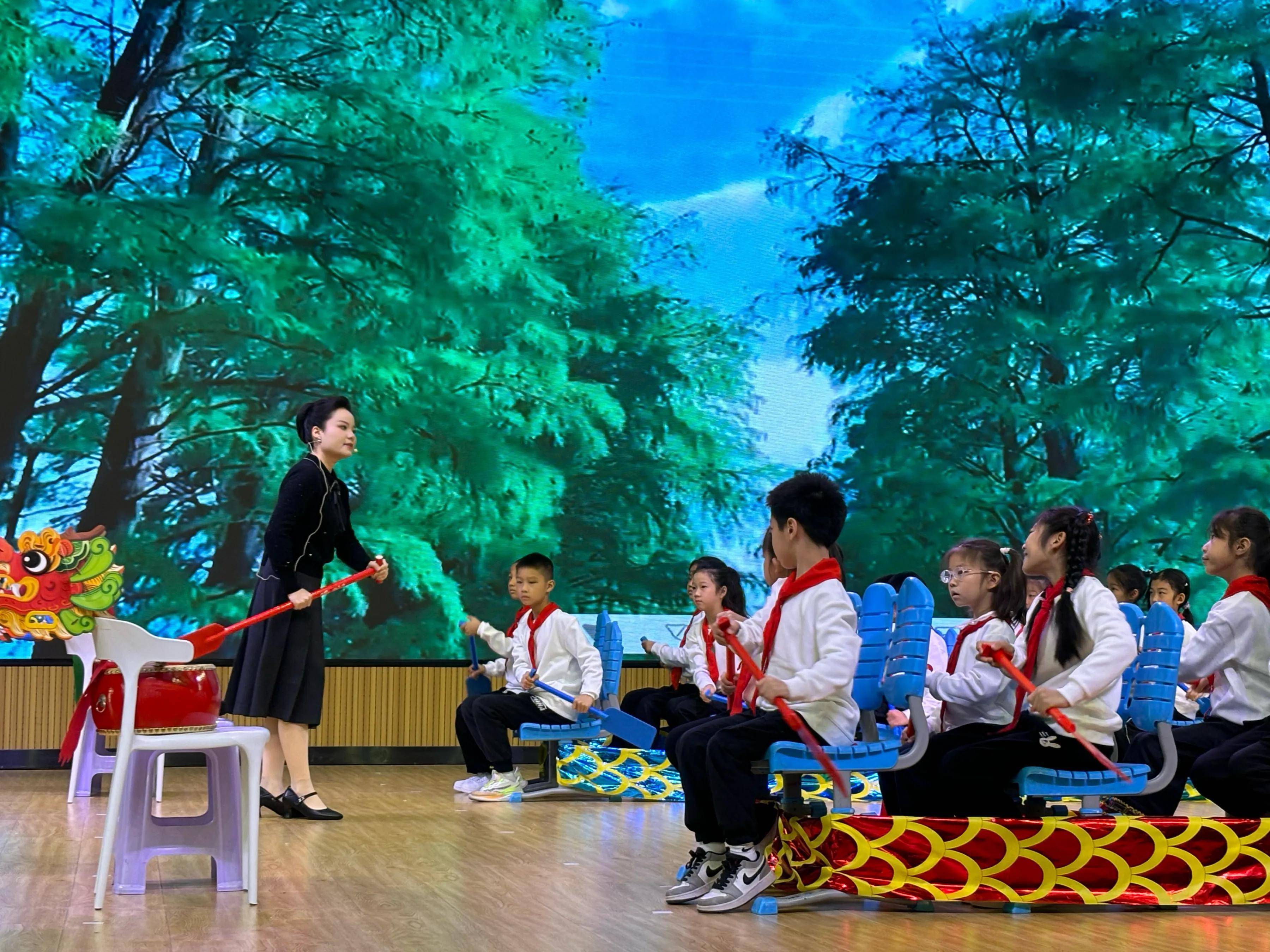 在武汉市光谷汤逊湖学校的教室里,小学生们正手抓船桨,跟班AI改编的《荡舟调》,在龙舟竞渡的千里浸体验中学习防溺水常识。